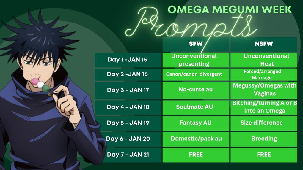 We want to reach as many works in this event as possible, so use the tag #OmegaMegumiWeek on Twitter so we can retweet it! We also made a collection over on AO3 (Omega Megumi Week 2023), where you’re welcome to add your work!